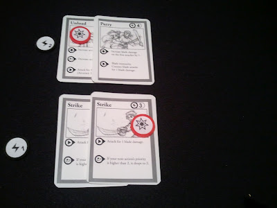 However, since focus has lower priority, the bottom player gained initiative that round. In the next round, the players have the same priority, but since the bottom player maintains initiative, the bottom player brutally finishes the top player off by dealing 2 damage. Mmm, this is not exactly what I want to happen… Yup, changes are a-coming.