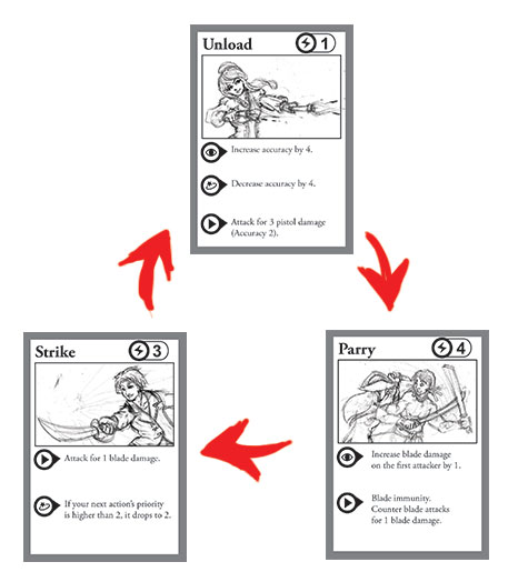 Before I move on from Pirates to Bar Fights, let me finish explaining how the revised pirates duel work. The trinity (Strike, Parry, Focus) forms the core of the system. Because focus is not an attack but a bonus to another action, I added another card that’d benefit directly from focus and adds a little randomness to the game, hence Unload. Since Strike at this point would have advantage over two cards (Focus and Unload), I’ve added one final card that’s sort of a bigger counter to Strike – and that’s how Brutalize came about.